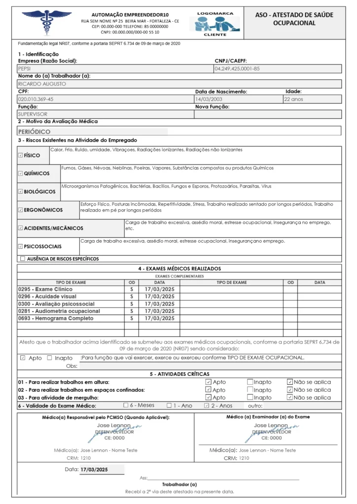 ASO – conforme novas exigencias da NR7 Março de 2020 e campo de Riscos Psicossociais 2025.